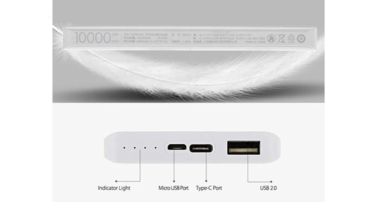 در این مدل از پاوربانک‌های «شیائومی» یک درگاه خروجی USB و یک باتری لیتیوم‌پلیمری با ظرفیت 10000 میلی‌آمپر ساعتی وجود دارد. این پاوربانک ابعاد مناسبی دارد و شما می‌توانید آن را به‌سادگی داخل کیف یا جیبتان بگذارید. بدنه‌ی آن با استفاده از پلاستیک ساخته شده و روی آن طرح‌هایی وجود دارد. وزن این شارژر همراه 177 گرم و ابعادش به ترتیب طول، عرض و ارتفاع 127، 69 و 12.7 میلی‌متر است. روی سطح این مدل از پاوربانک‌های زد ام آی دو درگاه ورودی microUSB و USB-C وجود دارد. زمانی که ولتاژ ورودی در یکی از این درگاه‌ها 5 ولت باشد، شدت جریان ورودی آن 2.0 آمپر است؛ همچنین اگر ولتاژ ورودی این درگاه‌ها 9 ولت باشد، شدت جریان ورودی 2.0 آمپر و اگر ولتاژ 12 ولت باشد، شدت جریان ورودی 1.5 آمپر خواهد بود.